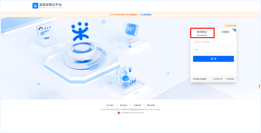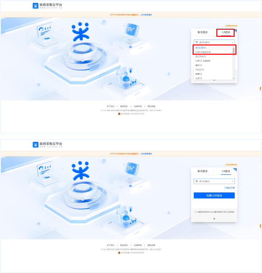 将USBkey证书插入电脑,进入【政府采购云平台】,登录方式选择CA登录,CA类型选择为【浙江汇信CA】,点击【检测CA并登录】,检测通过后输入密码即可完成登录