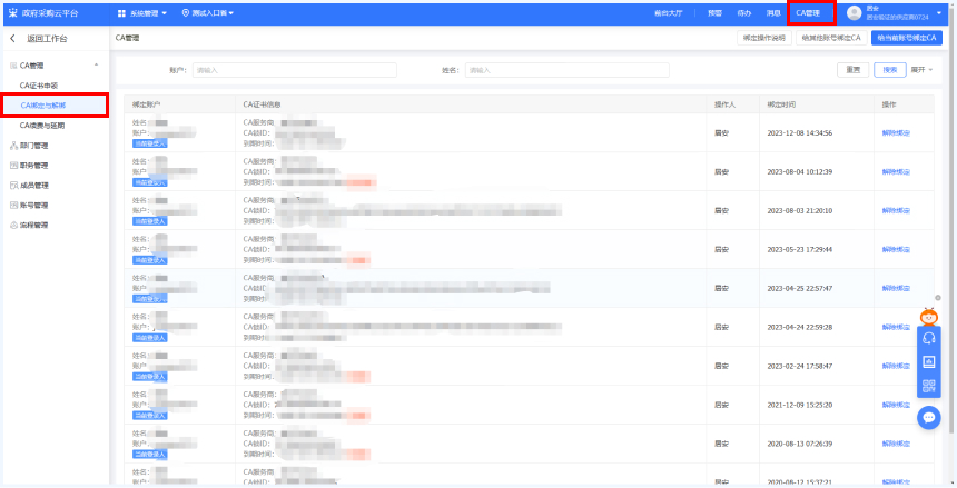 2、右上角点击【CA管理】,在左边的菜单栏中选择【CA绑定与解绑】