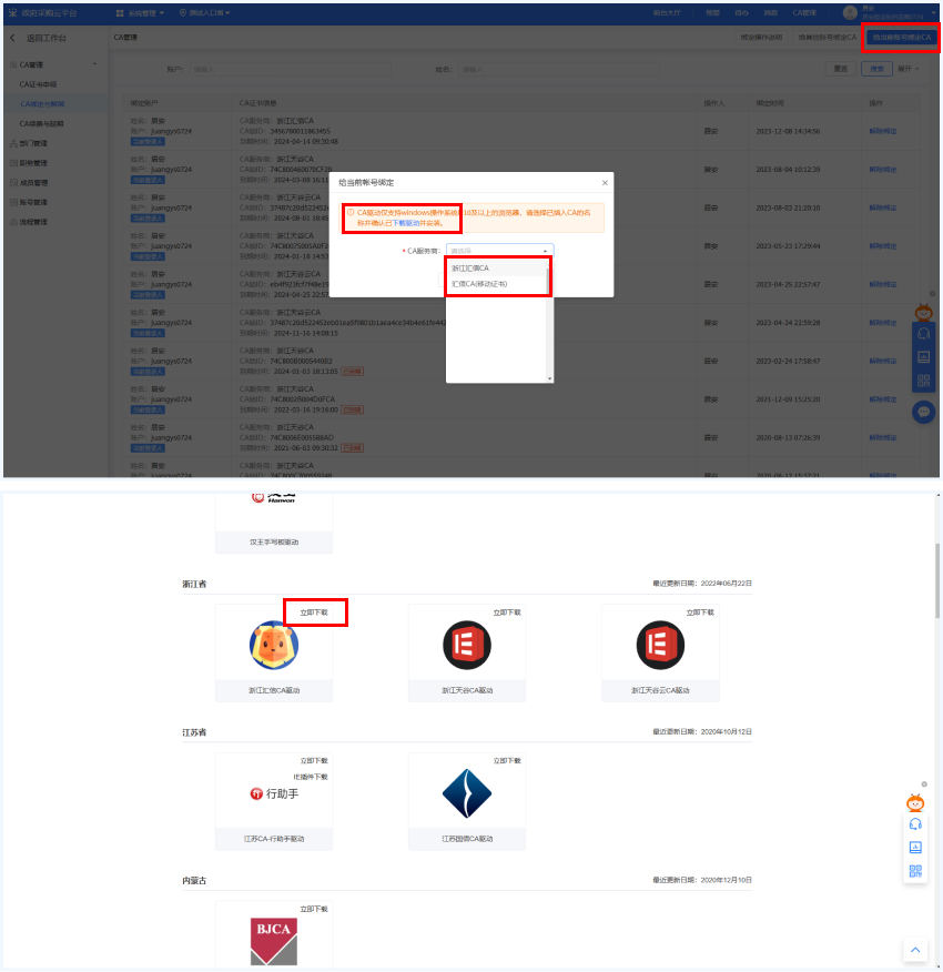3、在页面右上角点击【给当前账号绑定CA】,出现弹窗后选择证书类型点击确定完成CA证书的绑定。