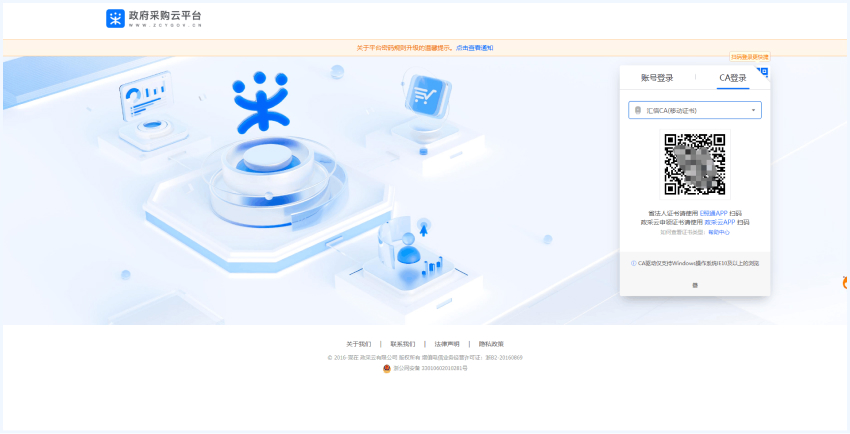 进入【政府采购云平台】,登录方式选择CA登录,CA类型选择为【汇信CA(移动证书)】,使用e照通app扫描登录二维码,在手机中输入使用密码,完成移动证书的登录