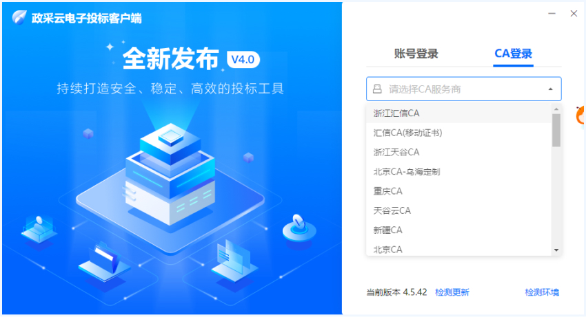 将USBkey证书插入电脑,打开政采云电子招投标客户端(点我下载客户端),选择CA登录并选中【浙江汇信CA】