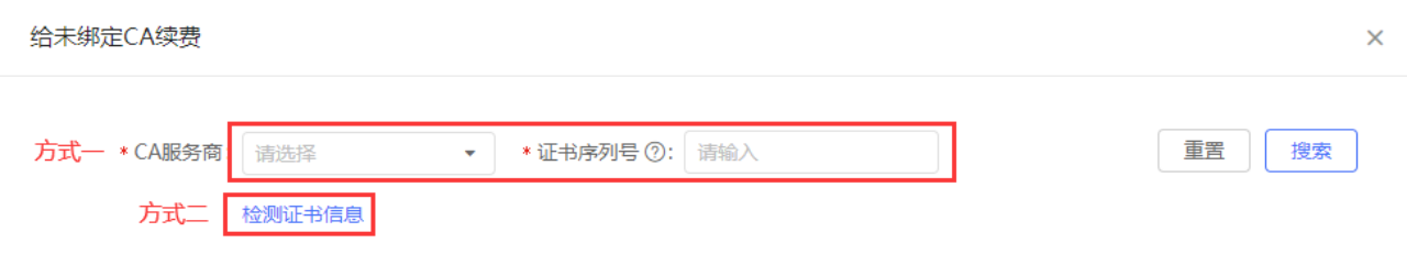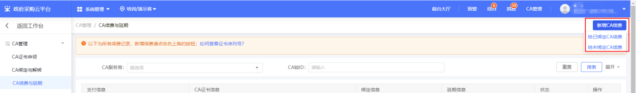 鼠标移至在页面右上角【新增CA续费】按钮上,可以选择“给已绑定CA续费”或“给未绑定CA续费”两种方式。
