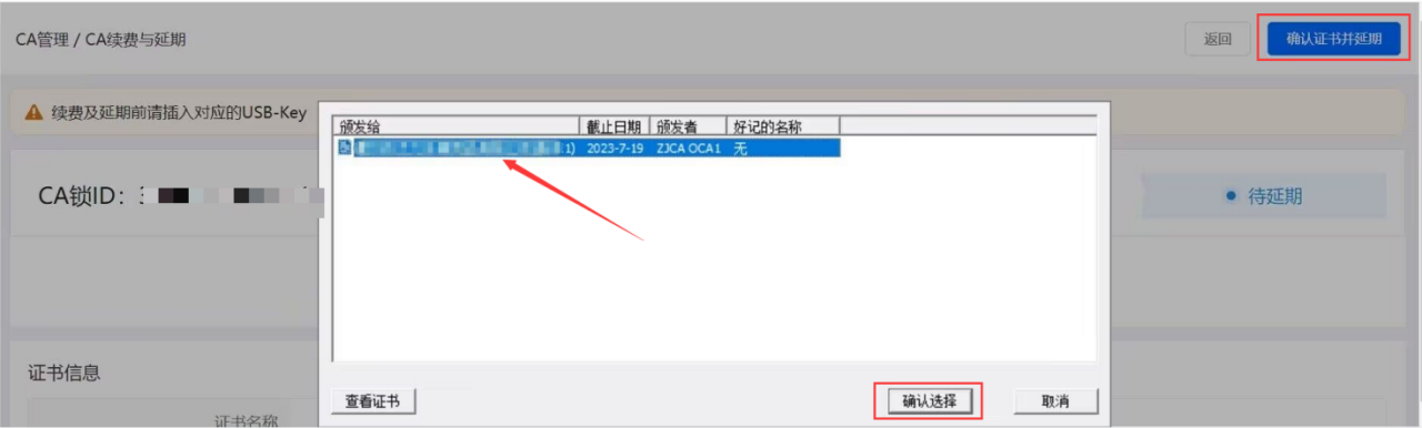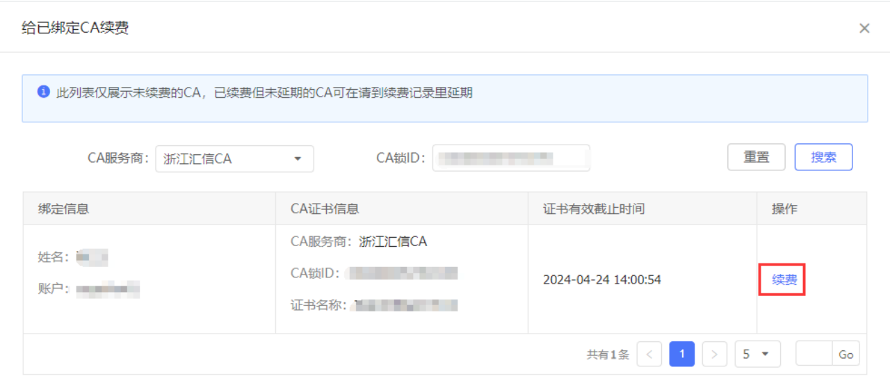 列表展示未续费的CA,,找到要续费的证书,点击【续费】按钮。