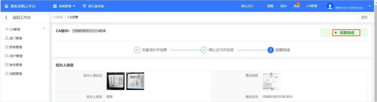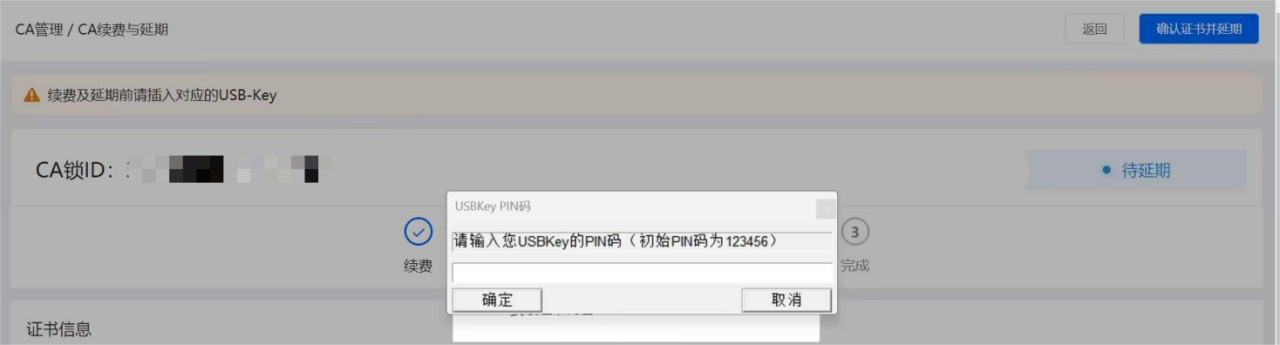 付费后,点击右上角【去延期】,选择证书,输入口令。此时系统会有温馨提示,点击“确定延期”,系统会进入延期操作,延期成功后,页面显示“延期完成”。