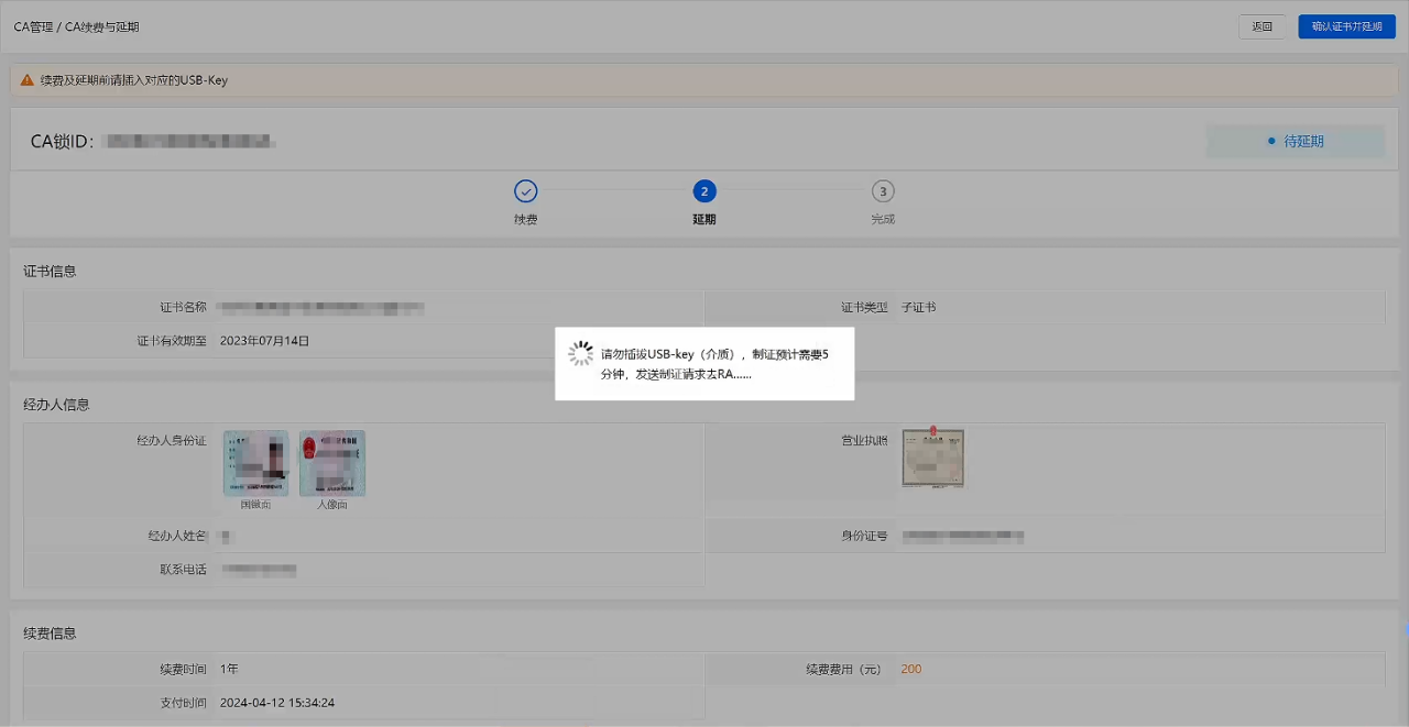 点击续费后,进入CA续费界面。需完善经办人信息、并“读取证书”。点击“立即支付”,通过支付宝/微信,扫码完成支付。